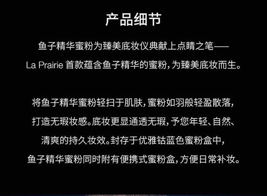 | 商品编码 | C047605 | 商品名称 | LA PRAIRIE莱珀妮 鱼子精华蜜粉 T1 |