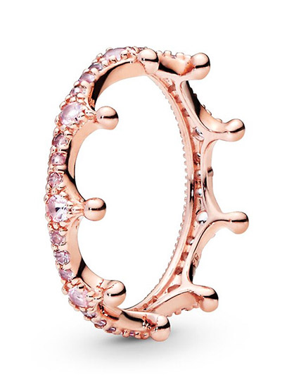 这枚粉红皇冠公主戒指以Pandora Rose精心打造,采用皇冠设计,镶嵌璀璨的粉红闪石。单独佩戴,简约优雅,搭配其他潘多拉皇冠戒指,个性大气。