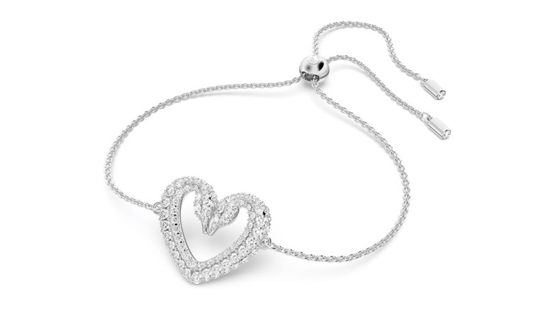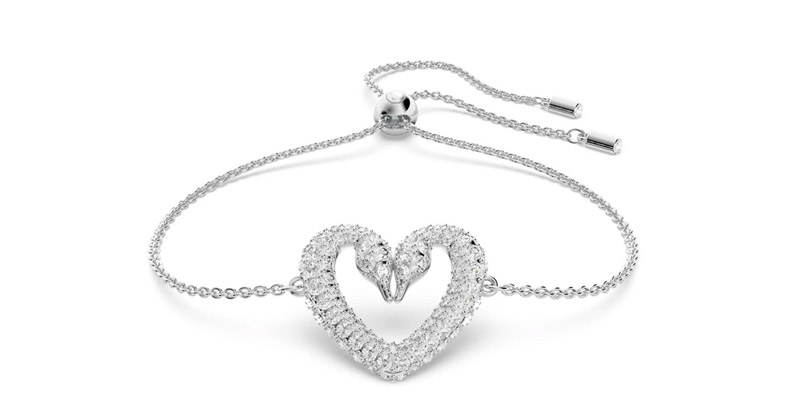 这款优雅的手链象征着永恒的爱情。手链的心形造型中点缀着经典的施华洛世奇天鹅标志。精致的密镶仿水晶搭配镀铑设计,时刻散发出璀璨夺目的光芒。手链采用拉拔机制,可以根据您的手腕调整到合适的大小,佩戴舒适方便。一款现代时尚、不落俗套的精巧单品。这款手链属于 Una 系列,为 Collection III 倾情巨献。