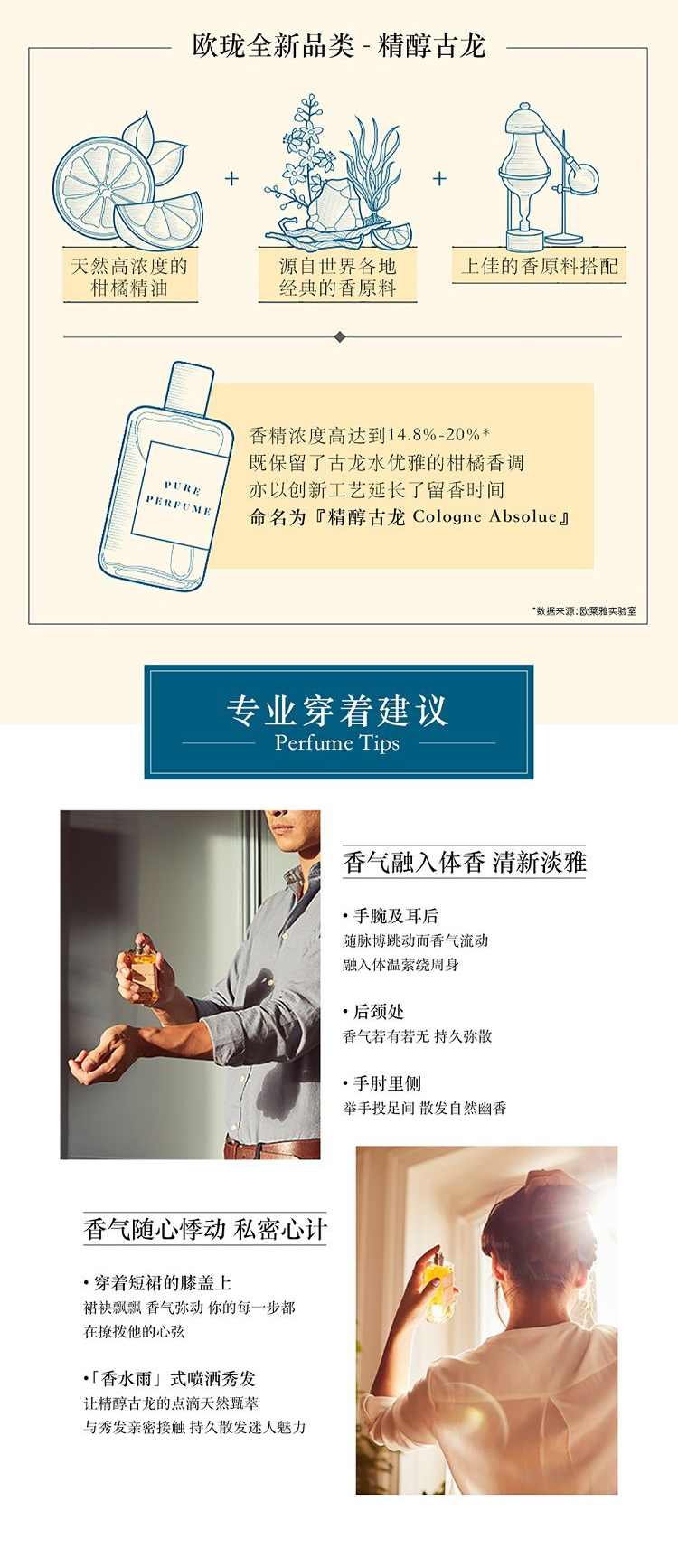 欧珑创始人Sylvie Ganter 和 Christophe Cervasel于2009年制造了全新的香水品类一Cologne Absolue 精醇古龙。他们彼此都钟情于古龙水的柑橘清香,但由于古龙水本身留香时间短,两人便渴望制造出一款既具清新优雅个性,又能像浓香水般留香持久的古龙水。精醇古龙通过绝无仅有的浓缩方式与15-20%极高浓度的精油相结合而成,是一款清新优雅又能留香持久的古龙水。