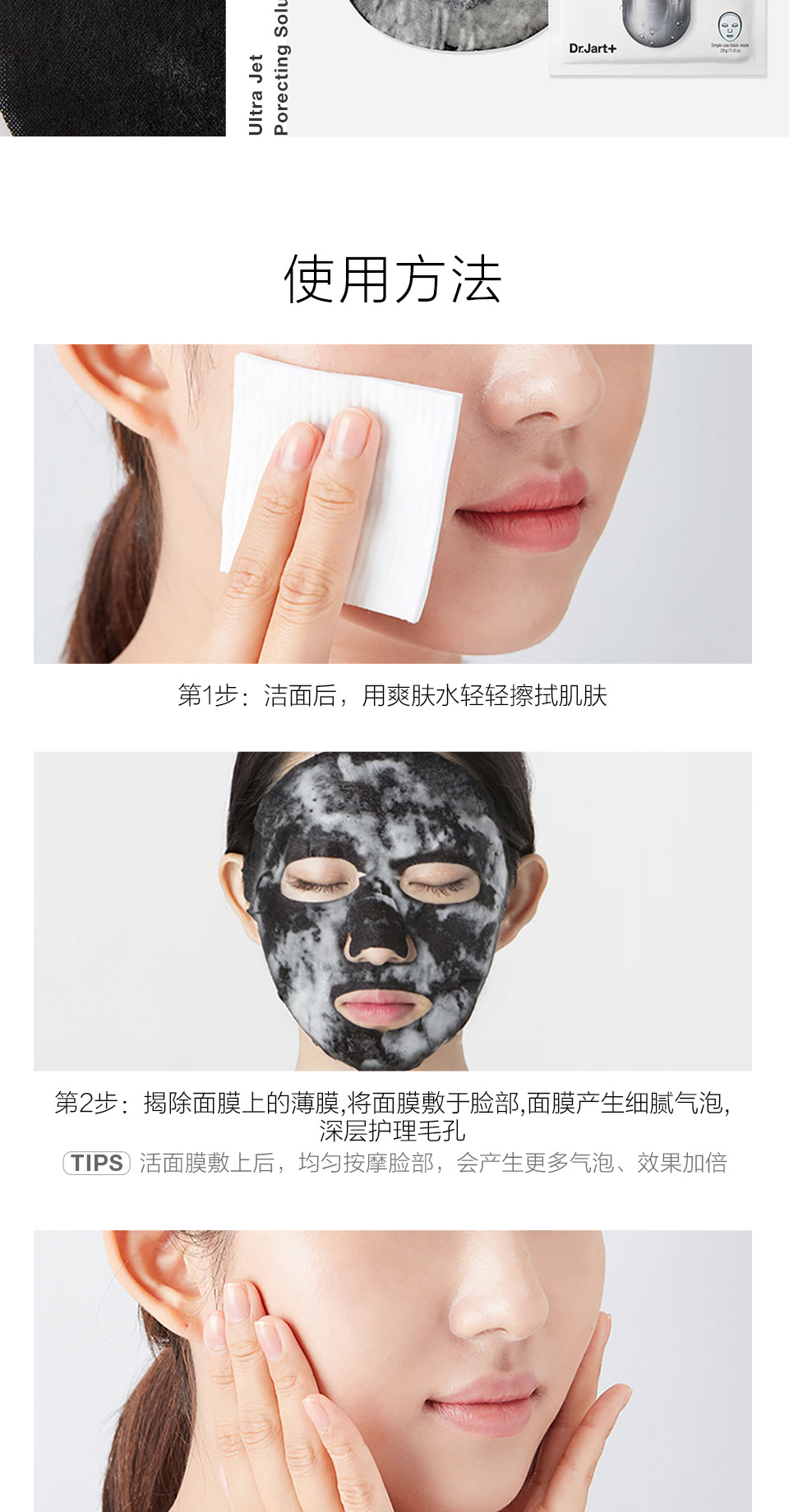 2.揭开面膜上的薄膜,将面赋于脸部,面膜产生细腻气泡,深层护理毛孔。