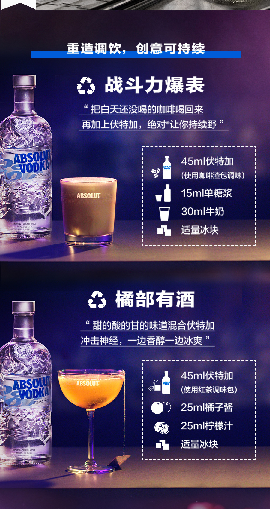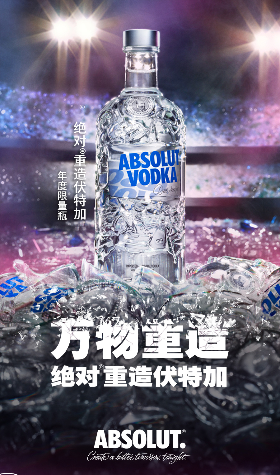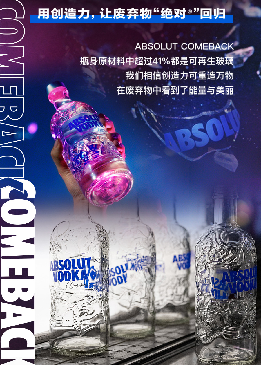 绝对伏特加是全球销量最大的高档烈酒品牌之一,也是世界排名第一的高档伏特加品牌。打造Absolut Comeback的瓶身设计,透过回收再利用,不仅赋予老旧废弃物新的生命,更从废弃物中展现力与美的创意,让Absolut伏特加酒瓶发挥最大价值。