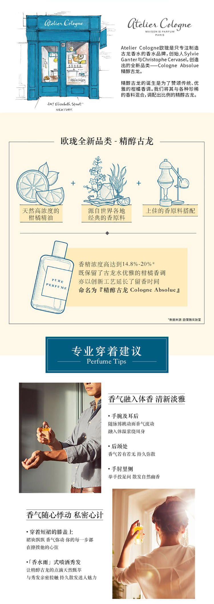 欧珑创始人Sylvie Ganter 和 Christophe Cervasel于2009年制造了全新的香水品类一Cologne Absolue 精醇古龙。他们彼此都钟情于古龙水的柑橘清香,但由于古龙水本身留香时间短,两人便渴望制造出一款既具清新优雅个性,又能像浓香水般留香持久的古龙水。精醇古龙通过绝无仅有的浓缩方式与15-20%极高浓度的精油相结合而成,是一款清新优雅又能留香持久的古龙水。