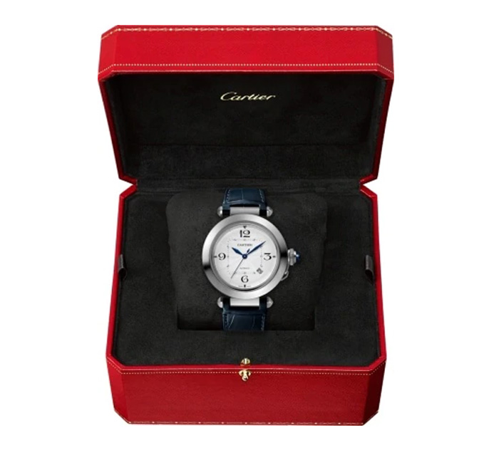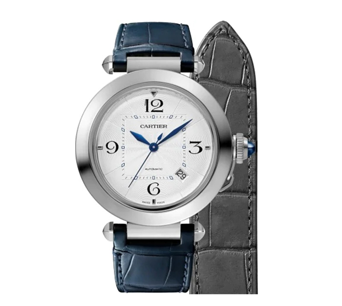 Pasha de Cartier腕表,41毫米表款,卡地亚1847 MC型工作坊精制自动上链机械机芯。精钢表壳,旋入式表冠盖和表冠镶嵌合成尖晶石,镀银雕纹表盘,菱形蓝钢指针,深灰色和海军皮表带,配备QuickSwitch表带快速替换系统,可替换式精钢折叠表扣。 表壳直径:41毫米。厚度:9.55毫米。防水深度10巴(约100米)。