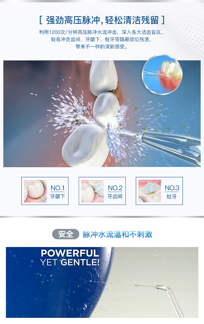 利用1200次/分钟高压脉冲水流冲击,深入各大洁齿盲区,轻易冲走齿间、牙龈下、蛀牙等隐蔽部位残渣,带来不一样的清新感受。