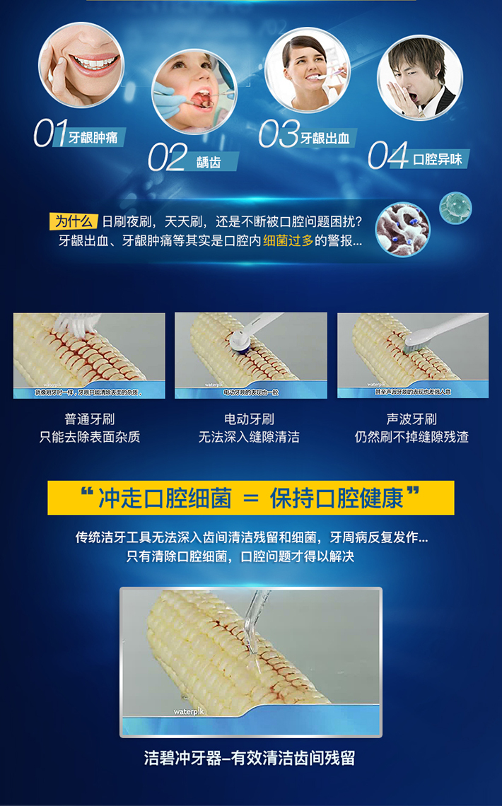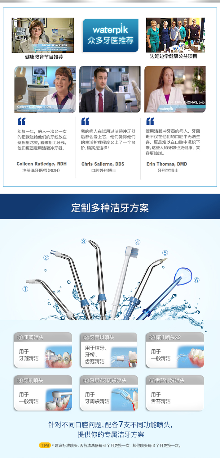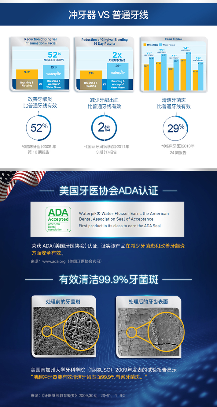 美国牙医杰兰德迈尔和工程师约翰马特里于1962年在美国创立waterpik®,并以水滴形状作为标志,全球首个& 唯一获得ADA认证的冲牙器品牌;70多份临床报告验证,Waterpik冲牙器在清洁牙菌斑、改善牙龈炎、减少牙龈出血方面真实有效,产品深受美国牙医推荐。