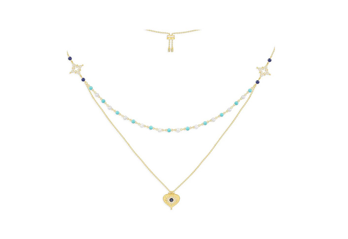 这款项链采用纯银手工制成,微镶了白色氧化锆石,并饰有蓝色纳米石、染色碳酸盐、青金石和淡水珍珠。