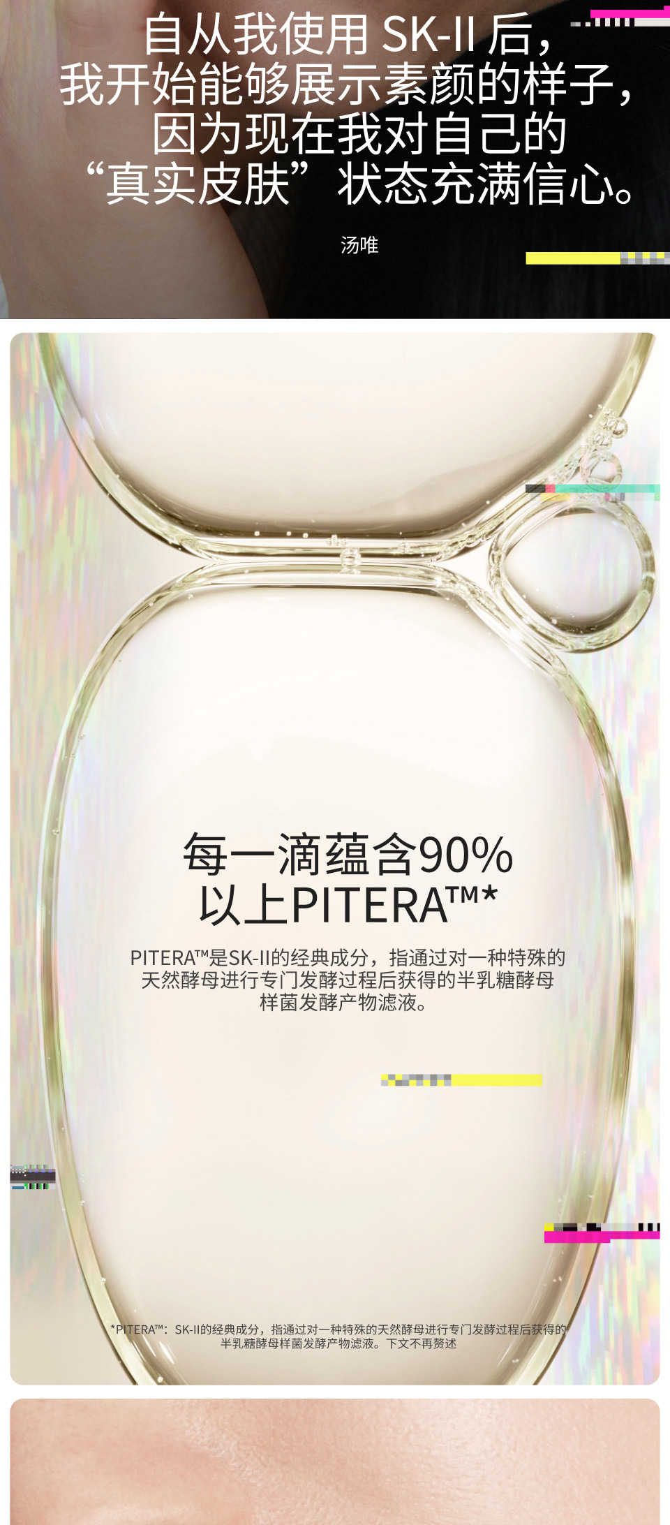 关于SK-II 40多年来,SK-II透过接触全球成千上万的女性,让她们从生活中体验到晶莹剔透肌肤的“ 奇迹” ,感受“ 改写命运” 的品牌理念。SK-II传奇性的故事,源自一间日本清酒酿酒厂,当时科学家发现一位年迈的酿酒工人,虽然脸上布满皱纹,但其双手却非常细嫩柔滑,其秘密就藏于酿酒的过程中。经过多年的潜心研究及验证,科学家们从当时存在的350种酵母中找到其中一种特殊酵母,并通过SK-II所独有的独特工艺进行专门发酵,终于发现了SK-II标志性的神奇美肌成分PITERA*,由此揭开了获得晶透美肌的秘密。此后,融入了PITERA*的SK-II护肤产品就一直成为世界各地名人实现肌肤焕变的秘密,其中包括汤唯和张子枫。 *PITERA:SK-II的经典成分,指通过对一种特殊的天然酵母进行专门发酵过程后获得的半乳糖酵母样菌发酵产物滤液。