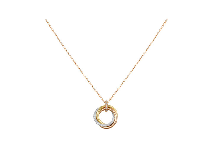 商品编码 | E943773 | 商品名称 | Cartier卡地亚Trinity系列 玫瑰金黄金白金镶钻 三环三色金项链 |